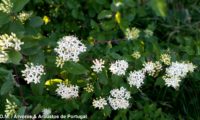 Flores hermafroditas brancas de 5 mm de diâmetro, que surgem em Maio e Junho, dispostas em inflorescências corimbosas terminais de 5 cm, com 20 a 100 flores sem brácteas e com pedúnculo bastante comprido. A corola é pequena com 4 pétalas estreitas e longas de 4-6 mm, um pouco pontiagudas que rodeiam 4 estames ligeiramente mais curtos.